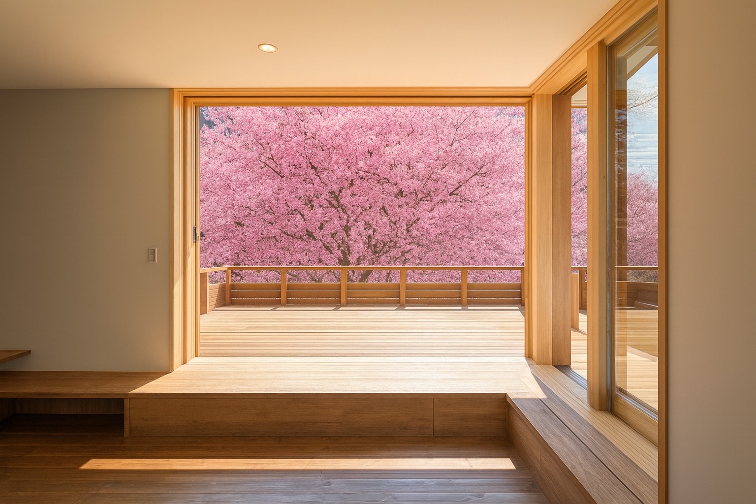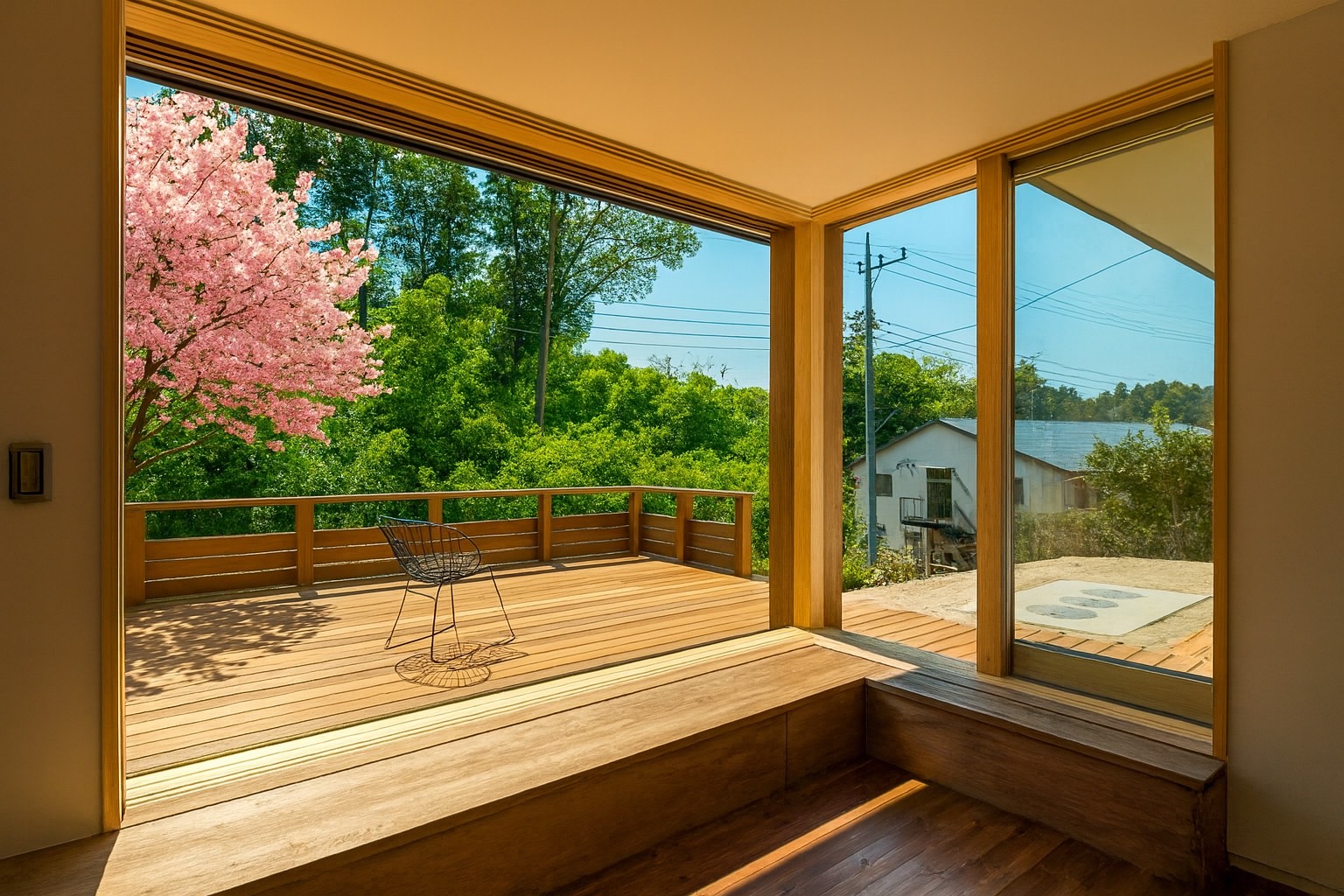 台所、ダイニング、木製デッキから外の景観がきれいに見ることが出来る案をご提案させていただきました。春にはダイニングの正面に大きな桜の木が満開になりデッキに腰掛て花見をされるのが最高とお喜び頂きました。
