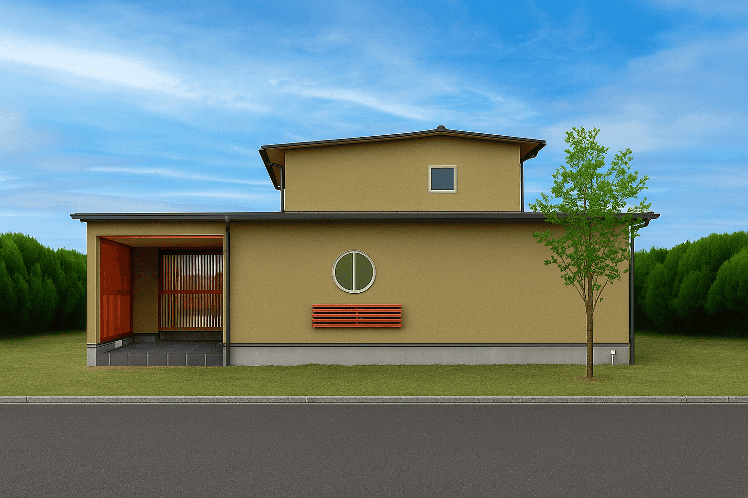 木格子と玄関の丸窓越しに見える障子が和の趣を感じさせる外観の2階建ての家。玄関ホールからは、和室とリビングに繋がる2つの動線の他、シューズクローゼットを兼ねた住人専用玄関もあります。また、キッチン→勝手口→洗面脱衣→寝室→広縁→リビングと回遊動線でつながっており、どの部屋にも自由に行き来できるノンストレス動線のプランです。玄関ポーチに設けた大きな坪庭は、屋根に大きな開口から自然の光が差し込むように設計し、家への出入りの楽しさを演出しました。また、坪庭は和室の地窓からも望むことができるため、室内からも自然を楽しむことが出来ます。2階寝室はリモートワーク用の造作ワークカウンターを設置し、寝室とワークルームを兼ねた部屋としました。また、2階にはシアタールームも設け、120インチスクリーンと65インチ大画面テレビ、スピーカーシステム等、本格的な設備で趣味の音楽鑑賞を存分に楽しめます。住む方のこだわりがたくさん詰まった素敵で楽しいお住まいです。