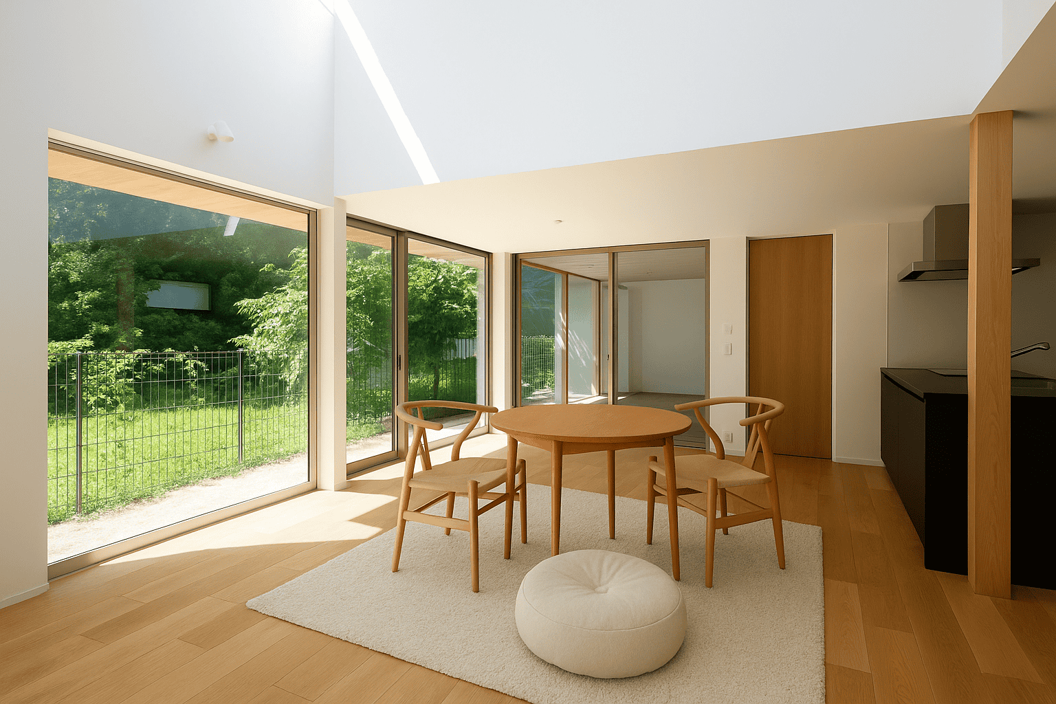 お施主様と二人三脚で創り上げたナチュラルテイストのモダンハウスです。シンプルな暮らし易さを追求しながらも細部までこだわりを持ち、間取り・性能はもちろん素材選びやスイッチ一つにも妥協せずお施主様のこだわりを形にしました。間取りは家中を大きく回遊できる動線を中心に水廻りや玄関を効率的に配置した誰もが住みやすさを感じる事の出来るつくりとなっています。また、室内の扉を出来るだけ少なくすることで、見通しの良い空間とし、楽に移動できる間取りとなっています。南側に面するリビングと寝室には同じ大きさの大開口サッシを設置しました。大開口サッシに面して、横につながるインナーテラスを設けることで洗濯物の外干しや趣味のDIYを楽しむことが出来ます。寝室サッシには引違い障子、リビングサッシにはハニカムサーモスクリーンを設置しそれぞれ違った柔らかな光を楽しむことが出来ます。室内床にはナラ無垢フロアを採用し、モダンの中にナチュラルさを感じられるお住まいとなりました。